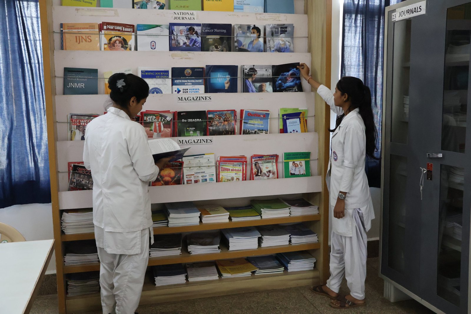 Our well-equipped library offers access to national and international journals, updated reference and revised nursing textbooks. Students can explore a rich collection of e-books, e-journals, nursing procedures, and teaching videos. Resources also include previous question papers, syllabi, and teaching materials for academic support. A quiet, tech-enabled space encourages focused learning and research excellence.
